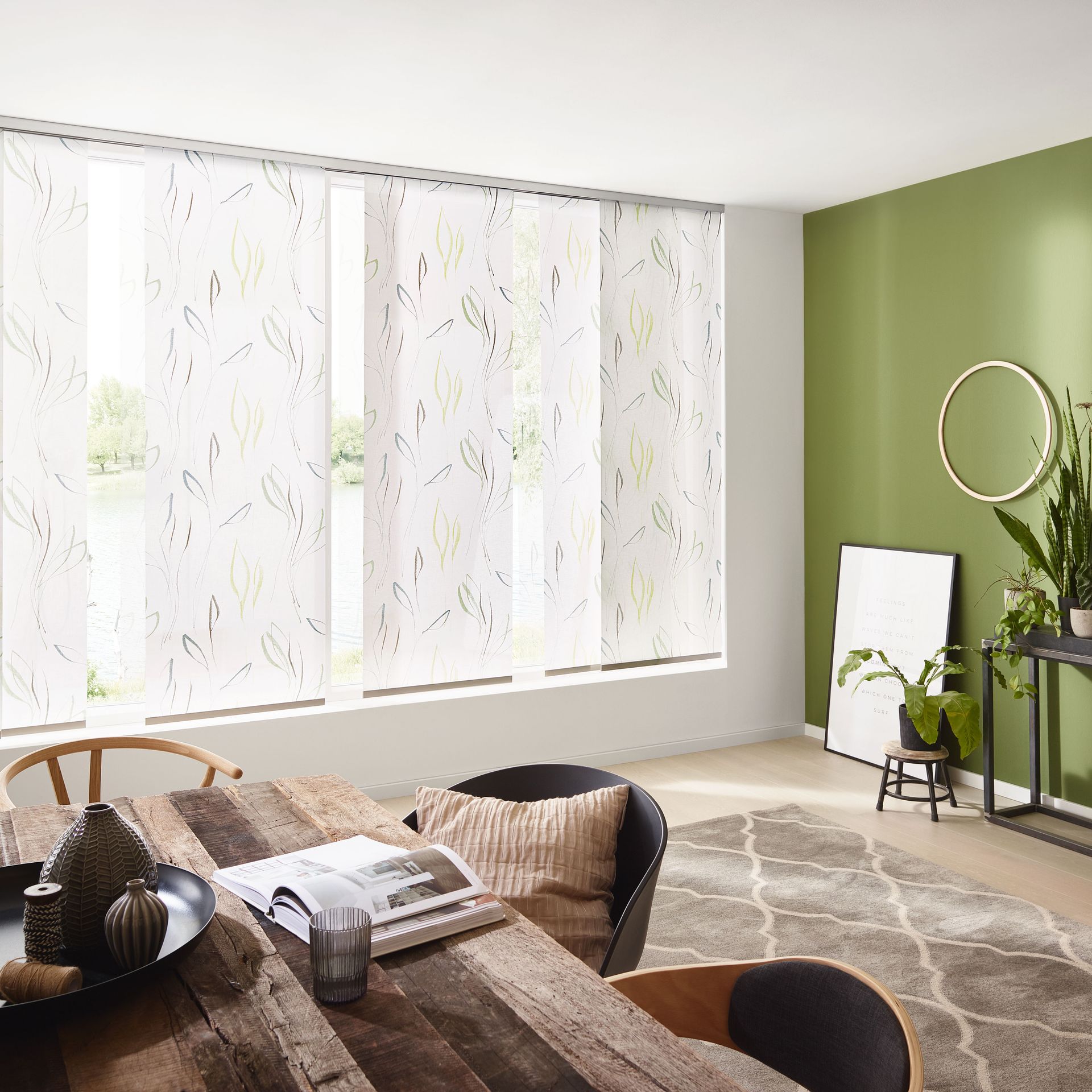 Die Paneele sind in individuellen Größen und praktisch unendlich vielen verschiedenen Stoffdesigns erhältlich. Die Paneele lassen sich einfach abnehmen und austauschen (Befestigung mittels Klettband). Die Montage der Schiebevorhänge erfolgt wahlweise an Wand oder Decke. Besonders für große Fenster, Glasfronten oder als Raumteiler bestechen Flächenvorhänge mit ihrer modernen, reduzierten Formensprache.